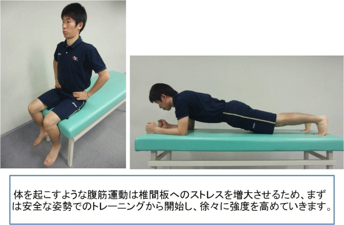 背骨を安定させるためには腹筋群を中心とした体幹の筋活動が不可欠です。症状に応じて、腰部への負荷の少ない運動から開始し、徐々に強度を高めながら、スポーツに必要な体幹筋力の獲得を目指します。