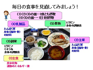 1食の食事に主食・主菜・副菜をそろえると栄養素のバランスは大方整います。その他、汁料理をプラスする事で、水分や具に含まれる栄養素(例:豆腐→たんぱく質・わかめ→鉄、野菜全般→食物繊維など)も補給できます。