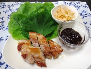 作り方: (1)白葱は薄く斜め切りし冷水につける。同じ作業を2〜3回行う。水気を切り材料Aと和える。 (2)材料Bを混ぜ、味付け味噌を作る。 (3)豚ばら肉両面に塩・こしょうし、焦げ目がしっかりつくよう両面を焼く。 (4)サンチュ、しそは水洗い、水気を切る。 Point:サムギョプサルは豚肉の赤身と脂身が三層になった「三枚肉」をさし、ジューシーで濃厚な味わいが特徴です。また、豚肉はビタミンB1が豊富でエネルギー生成を手助けしスタミナを維持します。 |